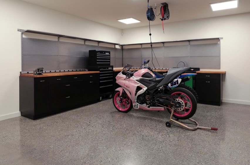 The Dale project was designed by Ana Williamson for a young couple without children, and no plans to have them. Instead, they race motorcycles — a pastime not quite as harrowing as raising kids, but one that influenced the design of the home, which needed to include a 1,200 square foot basement workshop at the back of the garage, complete with motorcycle lift, compressed air lines, sufficient ventilation and polished, exposed aggregate concrete floors throughout.