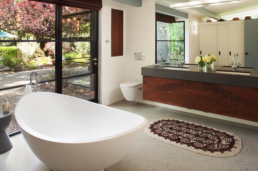 While adding an office and living room, and remodeling two and a half bathrooms, we kept with the ground and sealed concrete floors throughout. Smooth sheetrock transition from the original wood paneling for a much more contemporary bent. New clear cedar stretches the length of the the living room ceiling, jutting beyond floor-to-ceiling Hope’s windows, creating a translucent line between the lush garden just beyond and the comfort of the sofa. Sliding walnut panels create an artistic effect, but also function to close off the living room when desired. Earlier themes of walnut (cabinets this time) and Hope’s windows continue the home’s open theme into the master bath. Heath Ceramics hand glazed tiles used in the bathrooms, harmonize with the concrete, walnut and glass found in each.